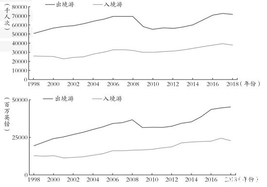 Figure 3 Comparison of the number of inbound and outbound tourists and their spending in the UK