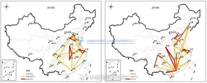 Adjacent provinces present each other as both source and destination. In the domestic tourist flow, the proportion of high-speed rail, civil aviation, and self driving travel continues to increase, while the proportion of road passenger transportation continues to decline. In 2019, out of the top 100 inter provincial tourist flows, 64 were between adjacent provinces, while only 36 were between non adjacent provinces. The exchange of tourists between urban agglomerations constitutes the "main line" and "branch line" network of domestic tourism flow. The top 10 inter provincial tourism flows in the country account for 16.5% of all 930 inter provincial tourism flows, forming the "mainline" of inter provincial tourism flows in the country. The inter provincial tourism flows ranked in the top 11-100 nationwide account for 38.6% of all 930 inter provincial tourism flows, forming the "branch line" of the national inter provincial tourism flows. It constitutes the core support of the national inter provincial tourism flow network.