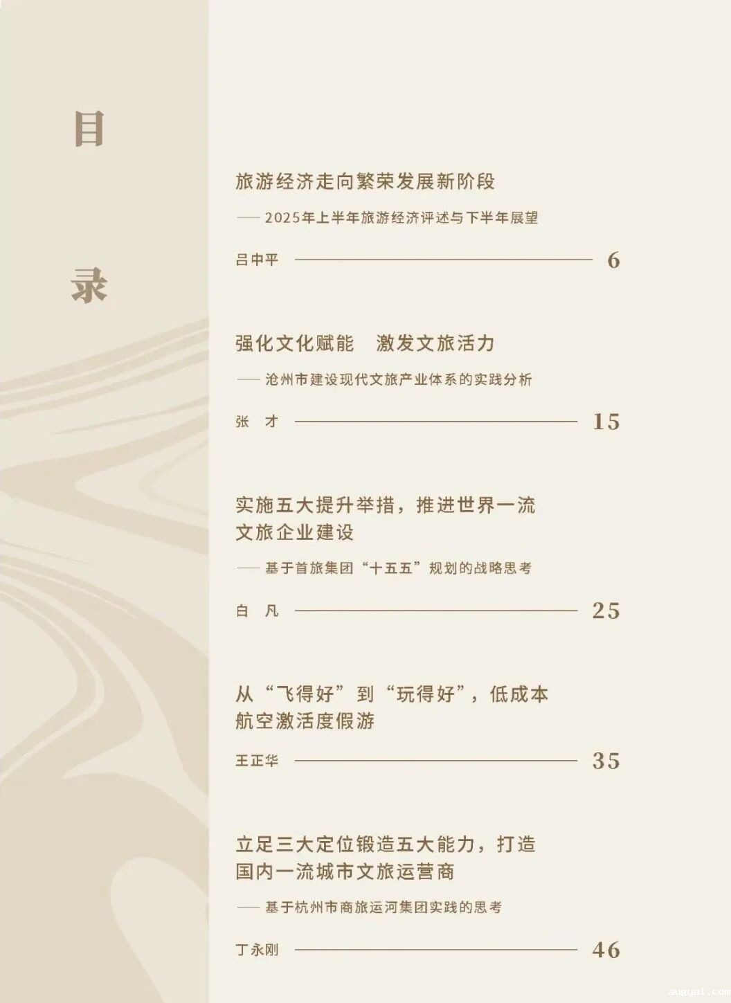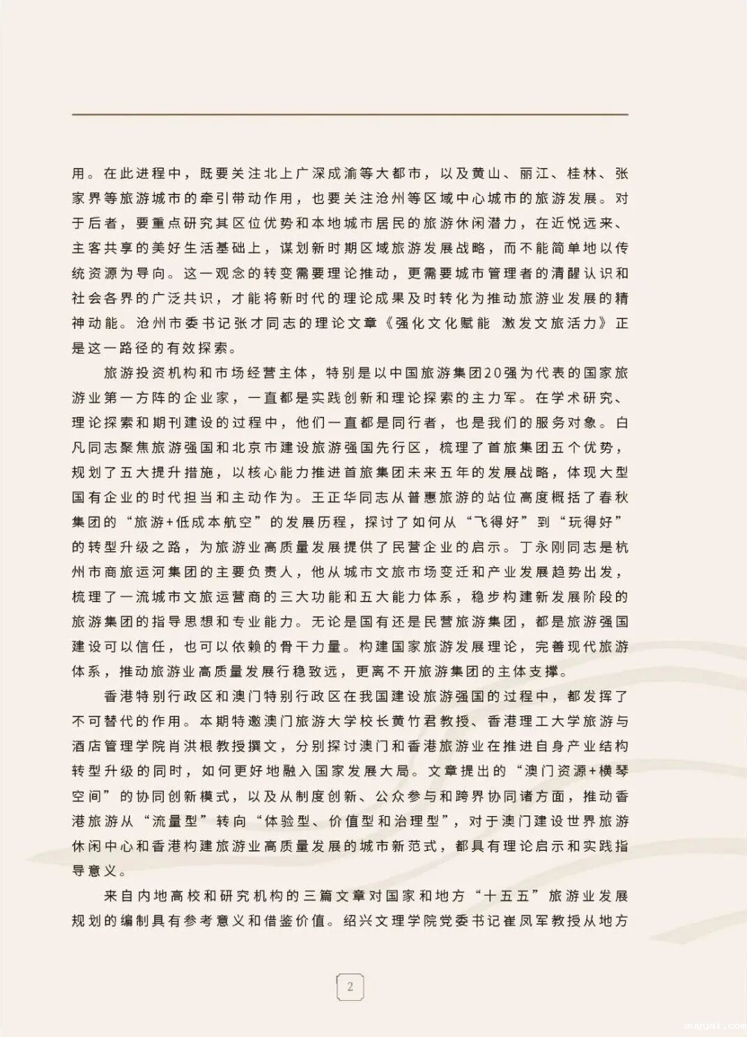 旅游投资机构和市场经营主体,特别是以中国旅游集团20强为代表的国家旅游业第一方阵的企业家,一直都是实践创新和理论探索的主力军。在学术研究、理论探索和期刊建设的过程中,他们一直都是同行者,也是我们的服务对象。白凡同志聚焦旅游强国和北京市建设旅游强国先行区, 梳理了首旅集团五个优势,规划了五大提升措施,以核心能力推进首旅集团未来五年的发展战略,体现大型国有企业的时代担当和主动作为。王正华同志从普惠旅游的站位高度概括了春秋集团的“ 旅游+低成本航空” 的发展历程,探讨了如何从“飞得好” 到“玩得好”的转型升级之路,为旅游业高质量发展提供了民营企业的启示。丁永刚同志是杭州市商旅运河集团的主要负责人,他从城市文旅市场变迁和产业发展趋势出发,梳理了一流城市文旅运营商的三大功能和五大能力体系,稳步构建新发展阶段的旅游集团的指导思想和专业能力。无论是国有还是民营旅游集团,都是旅游强国建设可以信任,也可以依赖的骨干力量。构建国家旅游发展理论,完善现代旅游体系,推动旅游业高质量发展行稳致远,更离不开旅游集团的主体支撑。