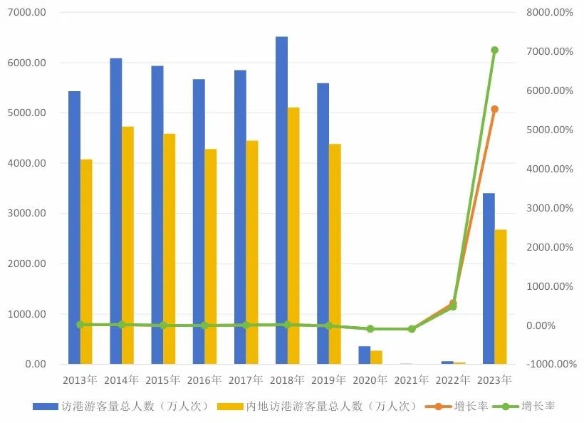 图1 内地访港游客数量、占比及增长率 (2013-2023)