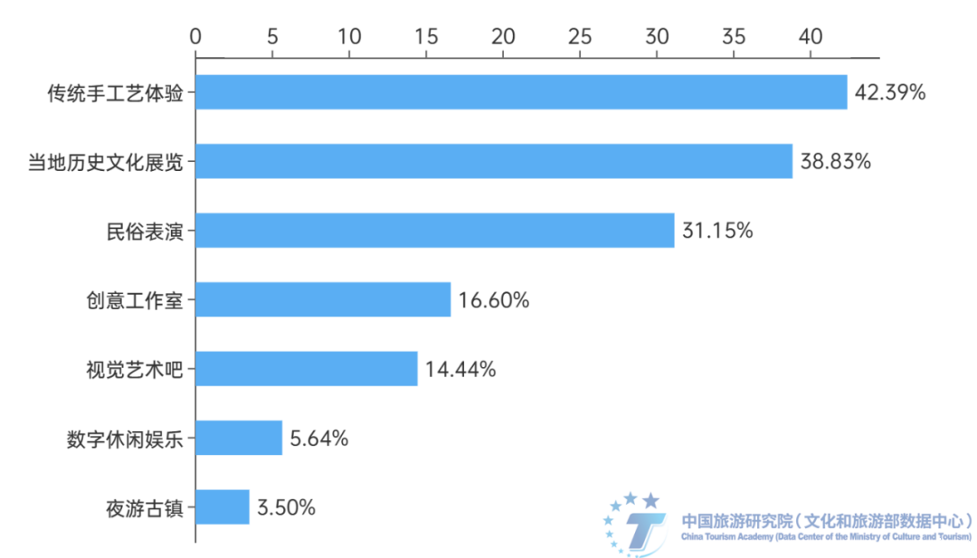 游客对在地文化的体验需求与期望较高。受访者希望古镇公共空间能够提供的服务与体验由高至低依次是传统手工艺体验(42.39%)、当地历史文化展览(38.83%)和民俗表演(31.15%)。创意工作室(16.6%)、视觉艺术吧(14.44%)、数字休闲娱乐(5.64%)和夜游古镇(3.5%)的选择比例相对较低。
