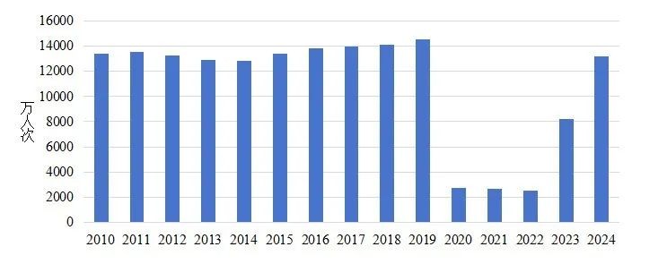 2024年,我国入境旅游市场恢复增长步伐进一步加快。与2023年仅有三个季度的复苏期不同,2024年一整年都是入境旅游市场的复苏期,复苏势头更为显著。根据最新的国民经济和社会发展统计公报,2024年,我国共接待入境游客13190万人次,同比增长达61%,恢复到2019年的九成以上,远高于2023年的恢复水平。