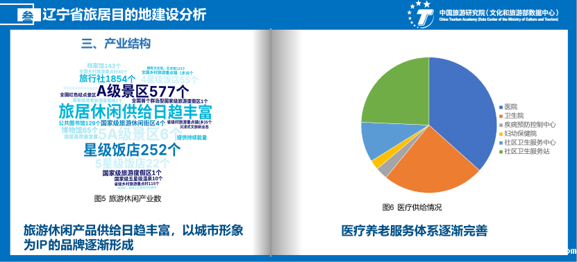 辽宁旅游休闲产品供给日趋丰富。辽宁拥有足够容纳旅居者的饭店、民宿、自有房产等生活空间,有文化馆、博物馆、公共图书馆、旅游景区、国家级、省级重点村镇、国家级旅游度假区等文化场所。医疗养老服务体系逐渐完善。全省医疗机构共34136家,其中涵盖医院、卫生院、疾病防控中心、妇幼保健院、社区卫生服务中心、卫生机构、就医床位等覆盖城乡的医疗卫生服务设施,为社区生活提供稳定就医环境。