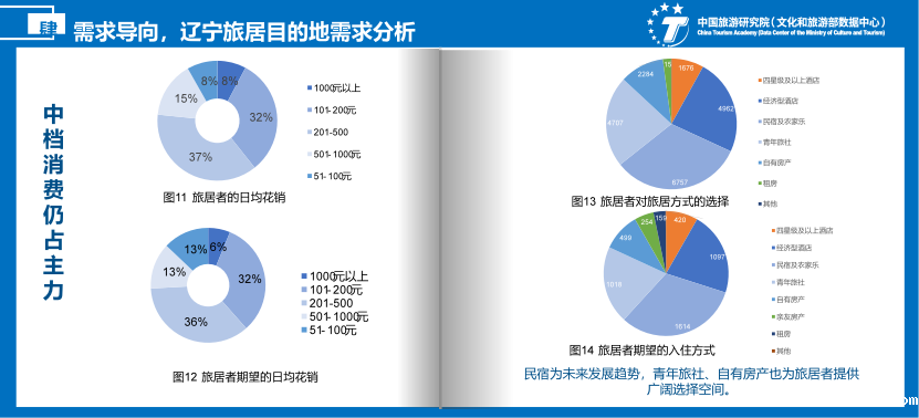 从旅居者日均消费的角度:旅居者的消费水平不断升级,追求精致化、多样化的旅居生活群体逐渐增多。调查问卷显示,消费者的日均消费集中在101-200,201-500元之间;在未来,应更加注重打造高质量的民宿集群、休闲购物中心,打造便于旅居者分层次、多样化、精致化的生活和消费场所;一个月、一至两个月的旅居时长最能体现旅居者对辽宁旅居在时间上的需求,长时间停留对旅居者吸引力不足;从住宿方式的角度:旅居者的住宿方式由酒店向民宿变革,为旅居者未来趋于选择的居住方式、青年旅社、酒店和自有房产提供广阔选择空间。