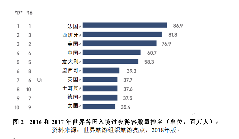 中国为世界提供了稳定增长的客流。根据世界旅游组织报告,亚太地区实现的旅游人数增长主要归功于稳定有力的区域内需求,中国为旅游市场的发展贡献最为突出。自2012年起,中国一直是全球最主要的出境旅游消费国之一。2017年,中国共接待国际入境过夜游客6074万人,排名世界第4,仅次于法国、西班牙和美国,增长率达到2.5%。2017年中国接待的国际游客占亚太地区总数的18.8%,旅游收入占亚太地区总量的8.4%。