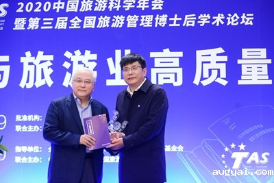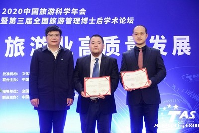 在2020中国旅游科学年会优秀论文颁奖环节,李仲广副院长宣读了一等奖、二等奖和三等奖获奖论文名单,戴斌院长为在京论文作者孙逸、耿波颁奖。