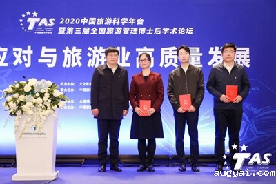 在2019年文化和旅游优秀研究成果发布颁奖环节,唐晓云副院长宣读获奖名单,戴斌院长为在京优秀成果代表韩元军、高佳彬、孙业红颁发证书、合影。
